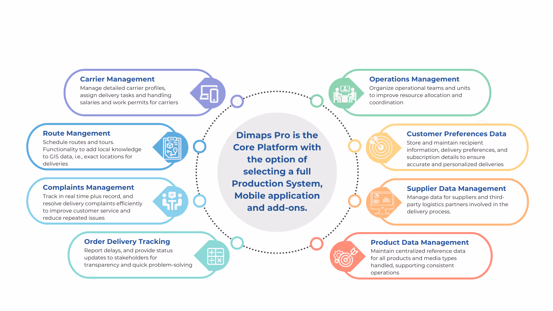 Dimaps Pro provides the software foundation for all of Dimaps solutions, including Production Systems and Dimaps Mobile plus add-on modules such as Route & Fleet Management. Dimaps Pro empowers delivery of media products, parcels and food or the collection of waste and recycling.